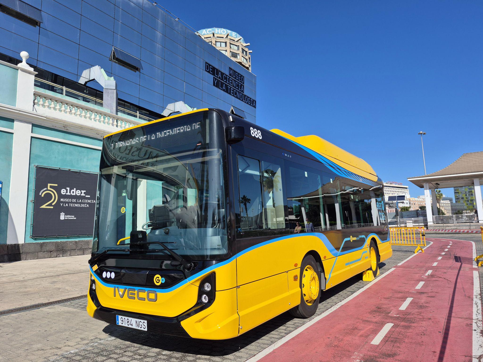 Los IVECO BUS E-WAY entregados son vehículos de 9.5 metros de longitud y 2.3 metros de ancho, dimensiones especialmente adaptadas a la geografía y características del entorno urbano canario. Cada unidad tiene capacidad para transportar hasta 56 pasajeros, de los cuales 16 pueden viajar sentados. El diseño incorpora un espacio reservado para silla de ruedas y cuatro plazas específicas para Personas de Movilidad Reducida (PMR), cumpliendo con los más altos estándares de accesibilidad. El piso bajo integral facilita el acceso a bordo, especialmente en paradas de alta frecuencia.